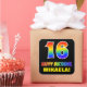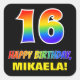 This fun, cheerful, and colourful birthday themed sticker design features a large number "16" and the message "HAPPY BIRTHDAY,", both coloured with a rainbow spectrum gradient inspired pattern, along with a bold yellow custom name. The background is coloured black. Fun stickers like this might be used when wrapping gifts being given to somebody in celebration of their 16th birthday, or perhaps may be handed out to the attendees at a birthday celebration or party. [~Z0000480]
