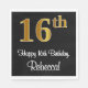 This sophisticated, stylish, and elegant birthday paper napkin design features a large ordinal number “16th” having an imitation/faux gold-like gradient pattern, plus the birthday greeting message “Happy 16th Birthday,” and a customisable name in a script-style font. It also has a black-coloured background. Paper napkins like this might be used when celebrating somebody’s sixteenth birthday. [~Z0000516]
