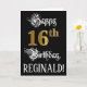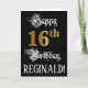 The front of this fancy and opulent birthday themed greeting card design features the message “Happy 16th Birthday,”, plus a personalised recipient name. Some of the message is in a lavish script-style text. The large number “16th” features a faux/imitation gold-inspired look pattern. The background is coloured black. The inside has a customisable birthday greeting message, or could perhaps be cleared and left blank if a message is to be written by hand instead. An elegant, customisable birthday greeting card like this might be a respectable way to send a birthday greeting message to somebody who is celebrating their sixteenth birthday. [~Z0000559]