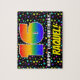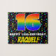 This cheerful and joyful birthday themed jigsaw puzzle design features a large number “16” with a multicolored rainbow spectrum inspired gradient pattern, along with the message “HAPPY 16th BIRTHDAY,”, and an editable recipient name. The background has an upbeat, multicolored star shapes pattern. A bold, personalised birthday puzzle like this might be used to acknowledge somebody’s sixteenth birthday. [~Z0000607]
