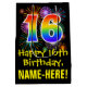 This colourful, fun, and exciting birthday themed giftbag design features a large number "16" with a rainbow spectrum gradient inspired pattern, along with the message "Happy 16th Birthday,", and a personalised recipient name. It also features a colourful bursting celebratory fireworks inspired background pattern. A birthday themed giftbag like this might be a fun way to wrap a gift or present being given to somebody who is celebrating their sixteenth birthday. [~Z0000509]