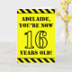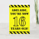 The front of this bold and attention-grabbing birthday-themed greeting card design features a custom name and the message "YOU’RE NOW 16 YEARS OLD!" in black stencil look text on a yellow colored background. The front also features an eye-catching black and yellow striped pattern at the top and bottom edges. The inside features a custom birthday greeting message, or could perhaps be cleared and left blank if a message is to be written by hand instead. A customizable birthday card like this might be a fun way to send a message in celebration of somebody’s sixteenth birthday. [~Z0000413]