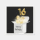 Gold balloons with sparkles and ribbons in a white box on black background for 16th birthday party.