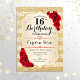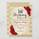 16th Birthday Invitation. Elegant design in gold and red. Features faux glitter gold stripes, red roses stylish script font and confetti. Perfect for a glam birthday party.