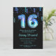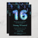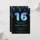 This elegant and glamourous birthday invitation features the number 16 in ocean print with blue and green confetti. The text combines handwritten script and modern sans serif fonts for a classy and sophisticated look.