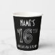 This stylish 1920s/1930s era inspired art deco style birthday paper cup design has a personalised name, along with the message “16TH BIRTHDAY PARTY!”. The number “16TH” has a fancy geometric lined styling. Luxurious birthday themed paper cups like these might be used at a party in celebration of somebody’s sixteenth birthday, or some other 16th event. [~Z0000658]