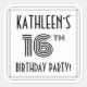 This 1920s/1930s style inspired sixteenth birthday celebration/party square sticker design features a custom name, a fancy art deco look inspired number “16th”, the message “BIRTHDAY PARTY!”, and a multi-line border. Stickers like these might be used when celebrating somebody’s 16th birthday. [~Z0000618]