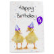 Cute fluffy yellow ducklings with confetti, party hats, and purple balloon on a white background for a 16th birthday.