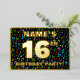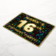 The front of this joyful and vibrant sixteenth birthday celebration foil invitation card design features a personalised name, a large number “16th”, the message “BIRTHDAY PARTY!”, and a border. The background of the front has an upbeat, multicolored pattern of music symbols and notes. The back features personalised details about the event, such as the date, time, place/venue, and any other important information. Editable invitations like these might be a fun way to invite guests/attendees to a birthday gathering being held to honour somebody’s 16th birthday. These might be more meaningful if that person is a singer, a songwriter, a musician, a composer, or appreciates music. [~Z0000601]