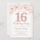 16th birthday party invitation for girl. Elegant floral design in faux glitter rose gold and white. Features diamond umber, blush pink roses and confetti. Perfect for a glam sweet sixteen bday celebration.