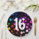 Neon rainbow dot pattern on black background for 16th birthday party.