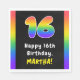 This upbeat and bold birthday themed paper napkin design features a large number “16“ with a colourful rainbow spectrum inspired gradient pattern, along with the message “Happy 16th Birthday,”, and a customisable recipient name. Birthday themed paper napkins like these might be used at a birthday party celebrating somebody’s 16th birthday. [~Z0000629]