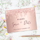 A girly and trendy Save the Date card for a Sweet Sixteenth 16th birthday party. A feminine pink, rose gold faux metallic looking background decorated with faux rose gold glitter drips. Templates for a date and name/age 16. Dark rose gold coloured letters. The text: Save the Date is written with a large trendy hand lettered style script.
