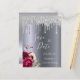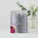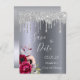 A Save the Date for a Sweet 16th birthday party. A dark faux silver metallic looking background. Decorated with dark purple and burgundy and rose pink flowers, faux silver glitter dripping, paint drip look. Templates for a name and a date. The text: Save the Date is written with a large modern hand lettered style script.