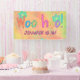 Have fun for a birthday with this WooHoo Birthday Banner. Customise for a year and name (as well as a different event). The text "WooHoo" is on a multicolor orange, coral and yellow background with magenta and teal green flowers. The topography is hand drawn and is multicolors of orange, magenta, blue green and yellow.