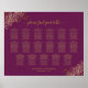 This seating chart contains table assignments for 170 guests at 17 tables, 10 guests per table. The design is simple yet elegant with gold text on a magenta or cassis purple background and gold faux foil lacy frills in the corners. Beautiful way to help your guests find the right table at your wedding reception. The title reads "please find your table" in elegant script calligraphy.