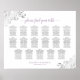 This seating chart contains table assignments for 170 guests at 17 tables, 10 guests per table. The design is simple yet elegant with dark grey and light purple or lavender text on a white background and silver faux foil lacy frills in the corners. Beautiful way to help your guests find the right table at your wedding reception. The title reads "please find your table" in elegant script calligraphy.