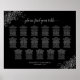 This seating chart contains table assignments for 170 guests at 17 tables, 10 guests per table. The design is simple yet elegant with gray text on a black background and silver faux foil lacy frills in the corners. Beautiful way to help your guests find the right table at your wedding reception. The title reads "please find your table" in elegant script calligraphy.
