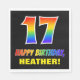 This cheerful, colourful, and fun birthday paper napkin design features a large number "17" and the message "HAPPY BIRTHDAY,", both having a rainbow spectrum gradient inspired pattern colouring, along with a bold yellow personalised recipient name. The background is coloured black. Fun, personalised birthday themed paper napkins like this might be used at somebody’s 17th birthday celebration. [~Z0000476]