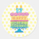 Happy Birthday colourful cake with yellow polka dot background round stickers. Customised for a 17th birthday. Seal your invitations or thank you envelopes. Use as labels for treat bags. Add to scrap book pages and photographs for accents. Use these stickers to put the finishing touches on all your birthday wishes.