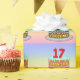 This fun and joyful birthday wrapping paper design features a cartoon-style depiction of a three-tier birthday cake having numeral-shaped candles on top showing the number “17“, along with the message “HAPPY 17TH BIRTHDAY,”, and a custom recipient name. The background has a multi-colour pastel rainbow spectrum inspired gradient pattern. Cheerful wrapping paper like this might be a fun way of wrapping a birthday present or gift being given to somebody who is celebrating their 17th birthday. [~Z0000622]