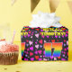 This happy and fun birthday themed wrapping paper design features a large number “17” with a rainbow spectrum gradient inspired pattern, along with the message “Happy 17th Birthday,”, and a customisable name. The background features a pattern of purple, red, and pink heart shapes of various sizes. Wrapping paper like this might be used when giving a gift or present in honour of somebody’s 17th birthday. [~Z0000549]