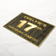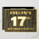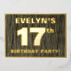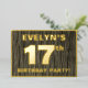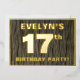 The front of this bold seventeenth birthday celebration foil invitation card features a personalised name, a large number “17th”, the message “BIRTHDAY PARTY!”, and a border, all in foil. There is a rustic, yet sophisticated, faux wood grain appearance inspired pattern for the background of the front. The back features personalised details about the event, such as the date, time, place/venue, and any other important information. Customised invitations like these might be used to invite attendees to a birthday party/gathering being held to celebrate somebody’s 17th birthday. [~Z0000598]