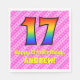 This happy and cheerful 17th birthday themed paper napkin design features a large number "17" having a colourful rainbow spectrum inspired gradient pattern. It also features the message "Happy 17th Birthday,", and a customisable name. The background features a dark pink and light pink stripes pattern containing loving pink heart shapes. Fun, editable birthday themed paper napkins like this might be used at somebody’s 17th birthday party. [~Z0000417]