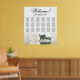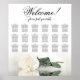 Enhance the elegance, romanticism, and flair of your wedding celebration with this 18 table seating chart, which accommodates up to 180 guests, with each table having 10 seats. The design showcases a stunning, contemporary floral motif that includes a solitary, long-stemmed ivory, white, or cream coloured rose placed horizontally and reflecting in a pool of water. The heading is written in elegant script calligraphy and reads "Welcome! Please find your seat," with the names of the newlyweds and the wedding date at the bottom. This seating chart offers a superb opportunity to warmly welcome your invitees and assist them in locating their respective seats with ease.