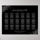 This seating chart will help your guests find their assigned tables at your wedding reception. It features a simple yet elegant design with light grey text on a black background. The title is written in beautiful script calligraphy lettering and reads: please find your table. The design features a lacy floral faux foil silver filigree in the corners. Contains seating assignments for 18 tables at 10 guests per table or 180 guests.