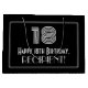This vintage appearance 1920s-1930s style inspired birthday themed gift bag design features a large art deco look inspired number "18", the message "Happy 18th Birthday,", a customisable name, and a border pattern consisting of thin lines. The background is coloured black. A gift bag like this might be used when wrapping a birthday present or gift being given to somebody who is celebrating their 18th birthday. [~Z0000497]