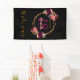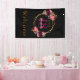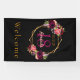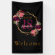 A banner for a 18th birthday party. A chic black background with a faux gold geometric frame. Decorated with dark purple and burgundy flowers, roses and boho style feathers. Templates for a name, age and a date. Date of birth or the date of the party. The name is written with a hand lettered style script, pink coloured letters, age 18 in purple and the date with golden numbers. The text: Welcome