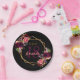 A plate for a 18th birthday party. A chic black background with a faux gold geometric frame. Decorated with dark purple and burgundy flowers, roses and boho style feathers. Templates for a name, age 18 and a date. Date of birth or the date of the party. The name is written with a hand lettered style script, pink coloured letters, age in purple and the date with golden numbers.