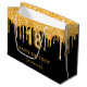 A chic black background. Decorated with faux gold glitter drips, paint dripping look. Personalise and add a name. With the text: Happy Birthday. The name is written with a mode hand lettered style script. Number 18 is written with a balloon style font.
