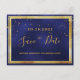 A Save the Date card for an 18th birthday party for a guy, man, male. A dark blue background decorated with golden confetti and a faux gold and black frame. The blue colour is uneven. Templates for a date and name/age 18. Golden coloured letters. The text: Save the Date is written with a large trendy hand lettered style script.