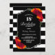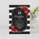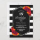 Black and white striped 18th birthday dinner party invitation featuring elegant red and orange floral displays. Text is fully customisable to enable you to include all of your own information for your birthday celebration.