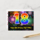 The front of this colourful, fun, and exciting birthday-themed postcard design features a large number "18" having a rainbow spectrum gradient inspired pattern. It also features the message "Happy 18th Birthday,", and a customisable recipient name. The front additionally has a vibrant and colourful background pattern inspired by the look of bursting celebratory fireworks. The back features a custom birthday greeting message, or could perhaps be cleared and left blank if a message is to be written by hand instead. A customisable birthday postcard like this might be a fun way to acknowledge somebody’s eighteenth birthday. Postcards like this might also be used to invite guests to a birthday party or celebration being held for somebody who is turning 18 years old. [~Z0000446]