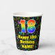 This colourful and fun music-themed birthday paper cup design features a large number “18” having a rainbow spectrum gradient inspired pattern. It also features the message “Happy 18th Birthday,”, and an editable name. The background features a vibrant and colourful pattern having music notes and symbols of various sizes and colours. Colourful, vibrant paper cups like this might be fun to have at a birthday celebration being held in celebration of somebody’s 18th birthday. [~Z0000541]