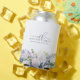 Elegant white rose and blue wildflower floral arrangement decorates the bottom of this 18th birthday party personalised can cooler. 18th is written in a modern script font. The remainder of the text is a spacious serif.
