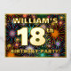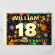 The front of this bold eighteenth birthday party/celebration foil invitation card design features a personalised name, a large number “18th”, the message “BIRTHDAY PARTY!”, and a border. The background of the front has a fun, multicolored pattern that resembles bursting celebratory fireworks. The back features personalised details about the event, such as the date, time, venue, and any other useful information. Personalised invitations like these might be a fun way to invite guests to a birthday gathering/party being held in celebration of somebody’s 18th birthday. [~Z0000602]