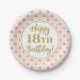Happy 18th birthday party plates in pink white and gold polka dots pattern.