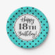 Happy 18th birthday party plates in turquoise white and black polka dots pattern.