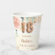 For an elegant 18th birthday party. A white and golden watercolored background. On the front and the back: Personalise and add a name and a date. Decorated watercolored rose gold and blush pink florals, eucalyptus greenery. Nr 18 is written with a balloon style font.