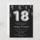 This elegant and glamourous birthday invitation features the number 18 in silver with silver confetti. The text combines handwritten script and modern sans serif fonts for a classy and sophisticated look.