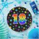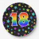 This cheerful, colourful, and fun paper plate design features a large number "18" containing a rainbow spectrum gradient inspired pattern. The background features a colourful star shapes pattern. Fun paper plates like this might be used at a party being held to celebrate somebody’s 18th birthday, or a couple’s 18th anniversary, or some other eighteenth event. [~Z0000493]