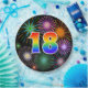 This colourful, cheerful, and fun paper plate design features a large number "18" coloured with a rainbow spectrum gradient inspired pattern. It also features a vibrant and exciting bursting celebratory fireworks inspired pattern. It has a black coloured background. Fun paper plates like this might be used at a celebration being held in honour of somebody’s 18th birthday, a 18th anniversary, or some other 18th event. [~Z0000490]