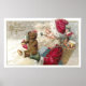 Santa Claus is smoking a silver pipe and holding up a teddy bear in a snowstorm. On his back is a basket containing a doll, toy horse and drum in a vintage Christmas postcard from 1913.