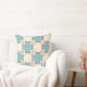 Whenever I glimpse a curtain or apron from the 1940's at a Flea Market, I find the comforting smells & feel of Grandma's kitchen flooding back to me. So pleasant, I wanted to share the experience by re-creating that look & feel in new fabrics & home decorating products. The design on this cushy throw pillow borrows it's colour scheme of soft aqua, ivory, ash grey & carmine red & layered tile pattern from a the background of a 1940's tablecloth. Back is solid aqua.