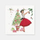Vintage 1950 Christmas woman in red skirt with a Christmas tree in the background.