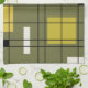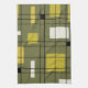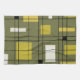 A midcentury modern abstract pattern with black lines and colourful square and rectangle shapes in chartreuse and avocado green.